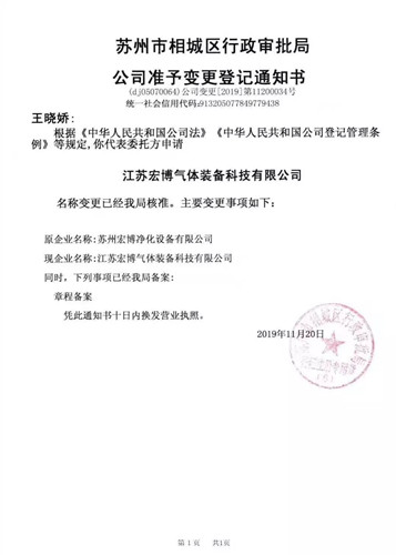 為適應(yīng)市場經(jīng)營和公司發(fā)展需要,2019年11月20日,經(jīng)蘇州市相城區(qū)行政審批局核準(zhǔn),原“蘇州宏博凈化設(shè)備有限公司”正式變更登記為“江蘇宏博氣體裝備科技有限公司”。